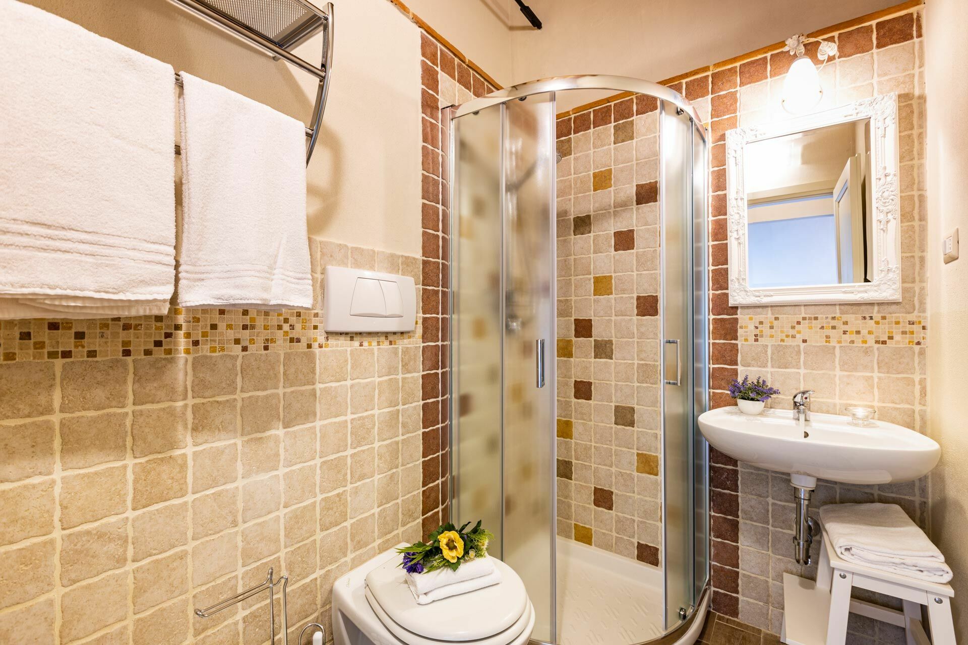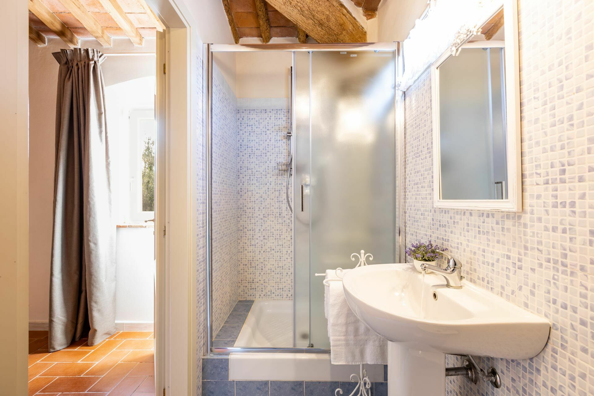 Primo piano: bagno con doccia, camera matrimoniale (aria condizionata) con bagno privato con doccia, camera (aria condizionata) con letto matrimoniale e bagno privato con doccia.
