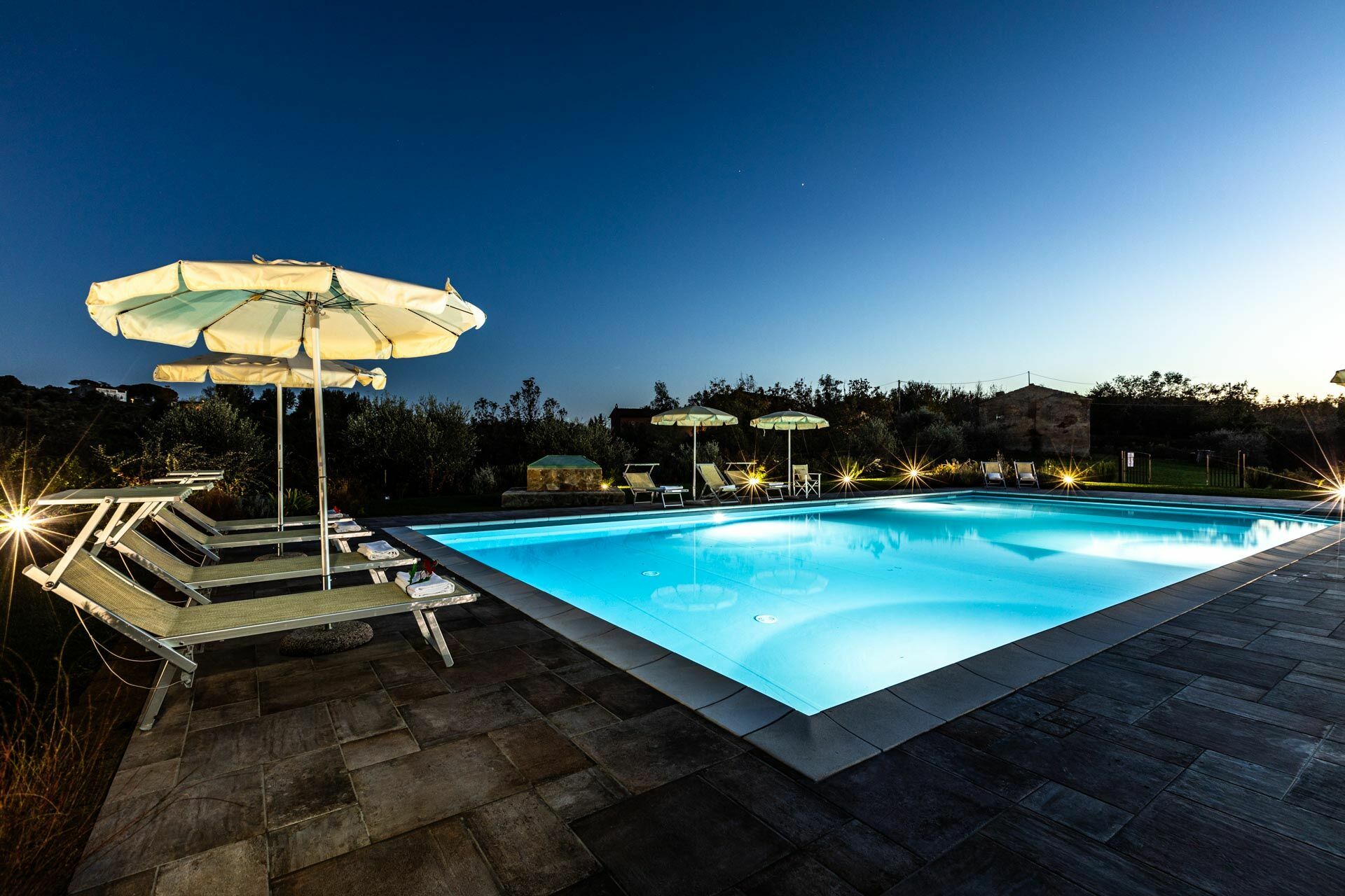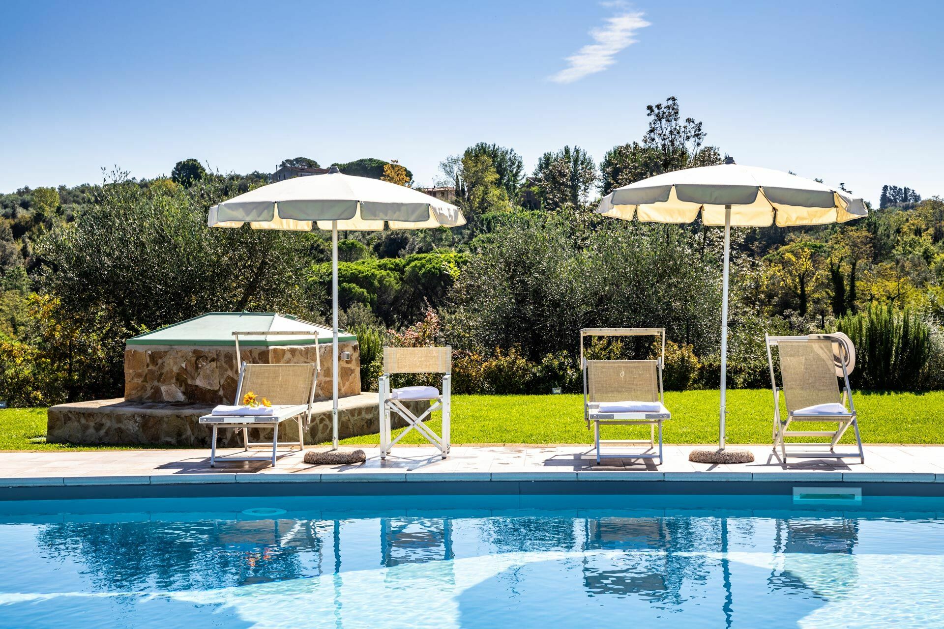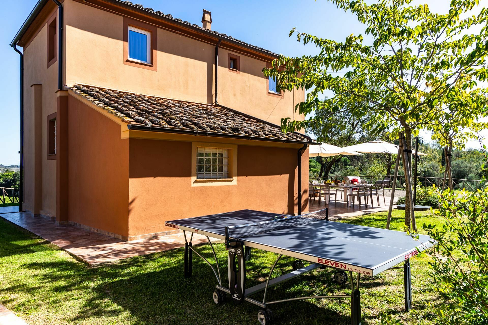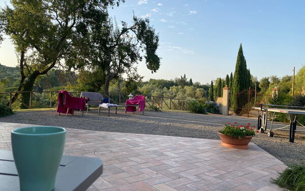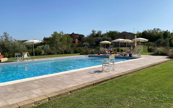 All'esterno, la villa è circondata da un ampio giardino che gode di totale privacy. La piscina ad uso esclusivo degli ospiti è distante circa 100 metri dall'entrata ed offre una bella vista panoramica sulle colline e sul paese di Montefoscoli: un luogo ideale per rilassarsi durante le giornate estive! Grazie ad un'area attrezzata esterna, gli ospiti possono organizzare pranzi e cene all'aperto da condividere con amici e familiari nella stagione più calda.